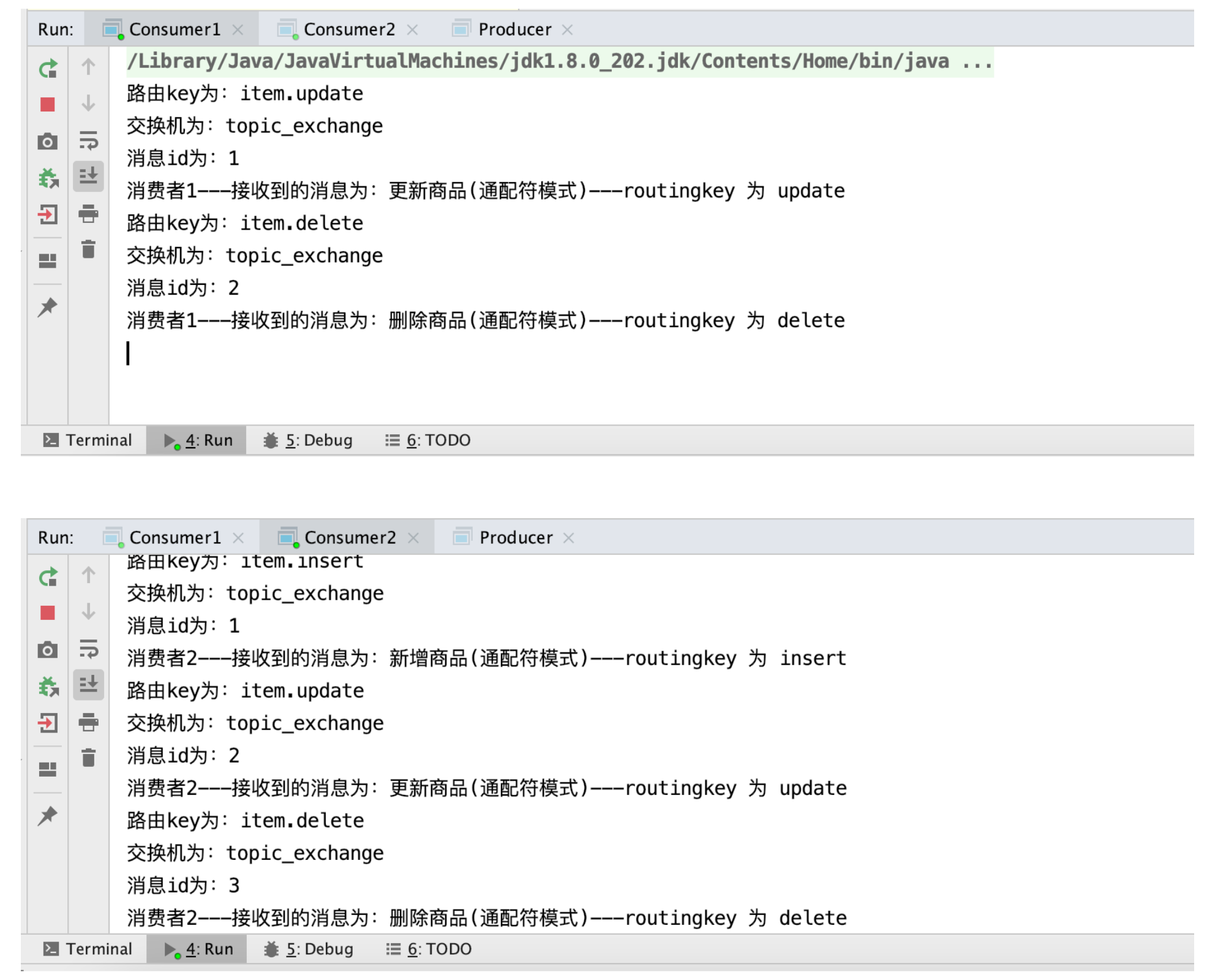 idea结果: 消费者1队列 接收:路由key为:item.update,item.delete;消费者2队列 接收:路由key为:item.update,item.delete,item.insert