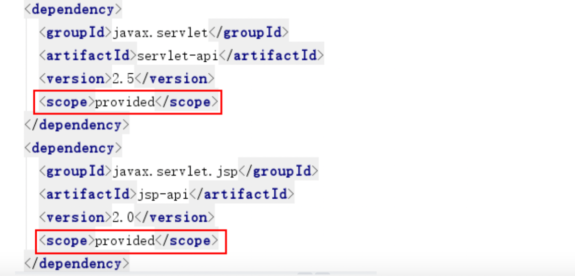 servlet-api 、jsp-api ------- provided (编译、测试 有效, 运行时无效 防止和 tomcat 下 jar 冲突)