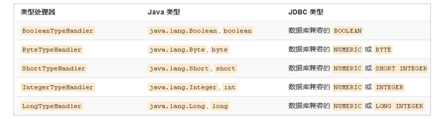论是 MyBatis 在预处理语句(PreparedStatement)中设置一个参数时,还是从结果集中取出一个值时, 都会用类型处理器将获取的值以合适的方式转换成 Java 类型。下表描述了一些默认的类型处理器(截取部分):