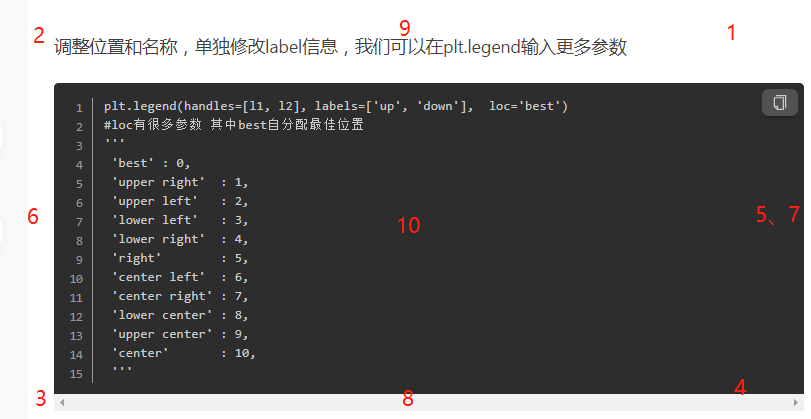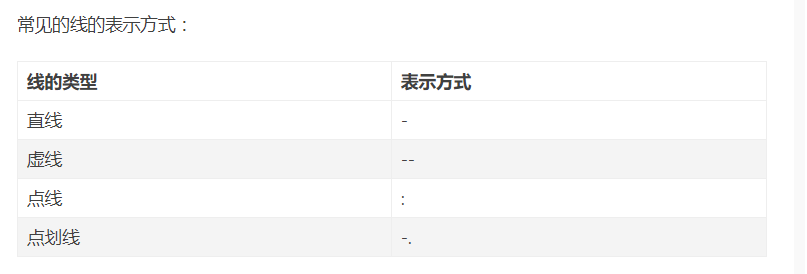 **Line Styles** ============= =============================== character description ============= =============================== ``'-'`` solid line style #实线 ``'--'`` dashed line style #虚线---- ``'-.'`` dash-dot line style #点虚线-。-。 ``':'`` dotted line style #细点线。。。。。 ============= ===============================