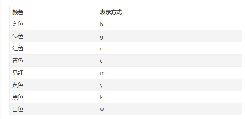**Colors** The supported color abbreviations are the single letter codes ============= =============================== character color ============= =============================== ``'b'`` blue ``'g'`` green ``'r'`` red ``'c'`` cyan #青色 ``'m'`` magenta #品红色 ``'y'`` yellow ``'k'`` black ``'w'`` white ============= ===============================