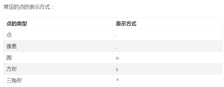 **Markers** ============= =============================== character description ============= =============================== ``'.'`` point marker ``','`` pixel marker #像素点 ``'o'`` circle marker ``'v'`` triangle_down marker #下三角 ``'^'`` triangle_up marker #上三角 ``'<'`` triangle_left marker #左三角 ``'>'`` triangle_right marker #右三角 ``'1'`` tri_down marker ``'2'`` tri_up marker ``'3'`` tri_left marker ``'4'`` tri_right marker ``'s'`` square marker #正方形 ``'p'`` pentagon marker #五边形 ``'*'`` star marker #星星 ``'h'`` hexagon1 marker #六角形1 ``'H'`` hexagon2 marker #六角形2 ``'+'`` plus marker #+ ``'x'`` x marker #x ``'D'`` diamond marker #粗钻石 ``'d'`` thin_diamond marker #细钻石 ``'|'`` vline marker #竖线 ``'_'`` hline marker #横线 ============= ===============================