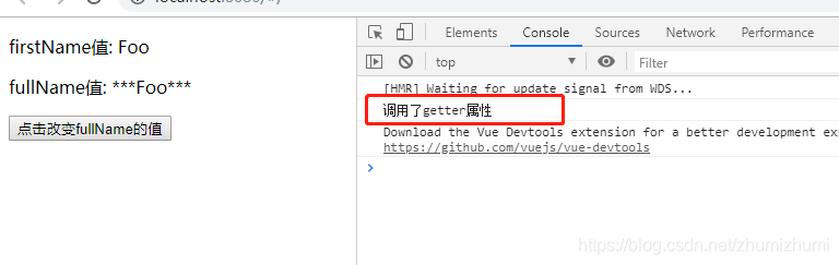 没有点击点击事件之前,页面的输出:可以看到,在没有进行任何操作之前getter就会自动执行,页面中的fullName已经改变