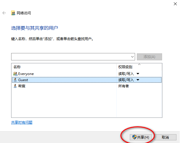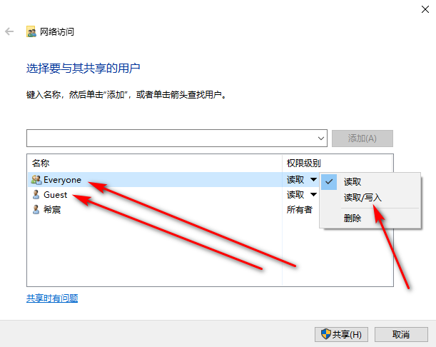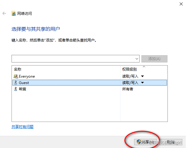 把Guest、Everyone账户全部添加上,权限级别选择:读取/写入