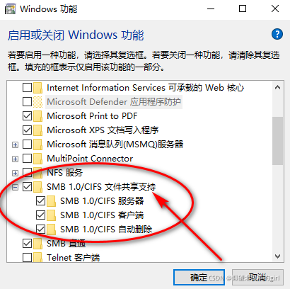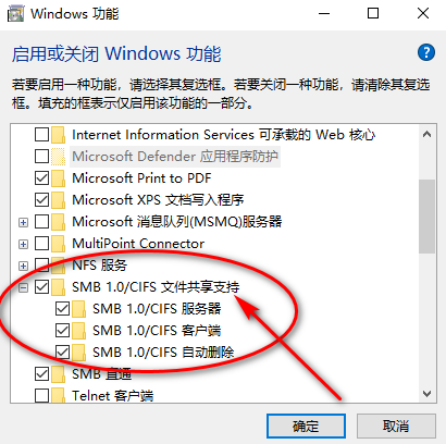 四、启用或关闭Windows功能,打开SMB 1.0/CIFS 文件共享支持,按图示全部打钩。