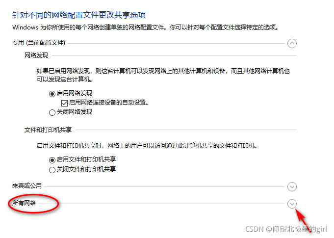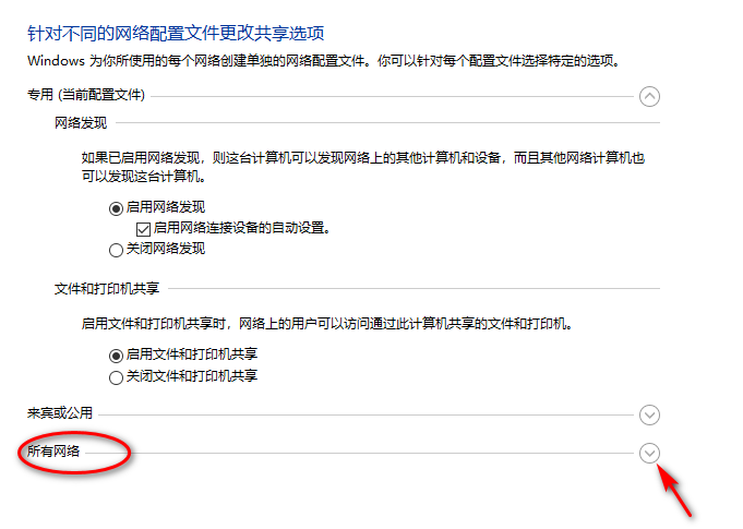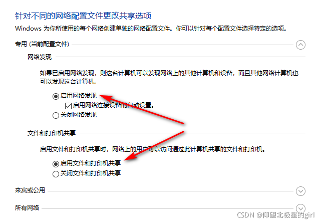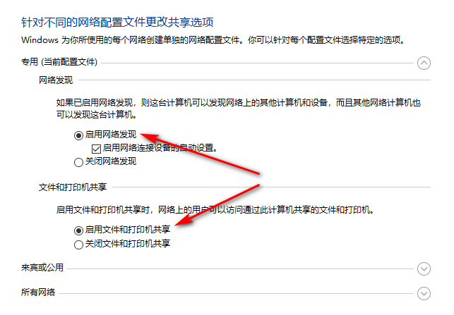 设置专用网络:启用网络发现及启用文件和打印共享。如图所示打钩。