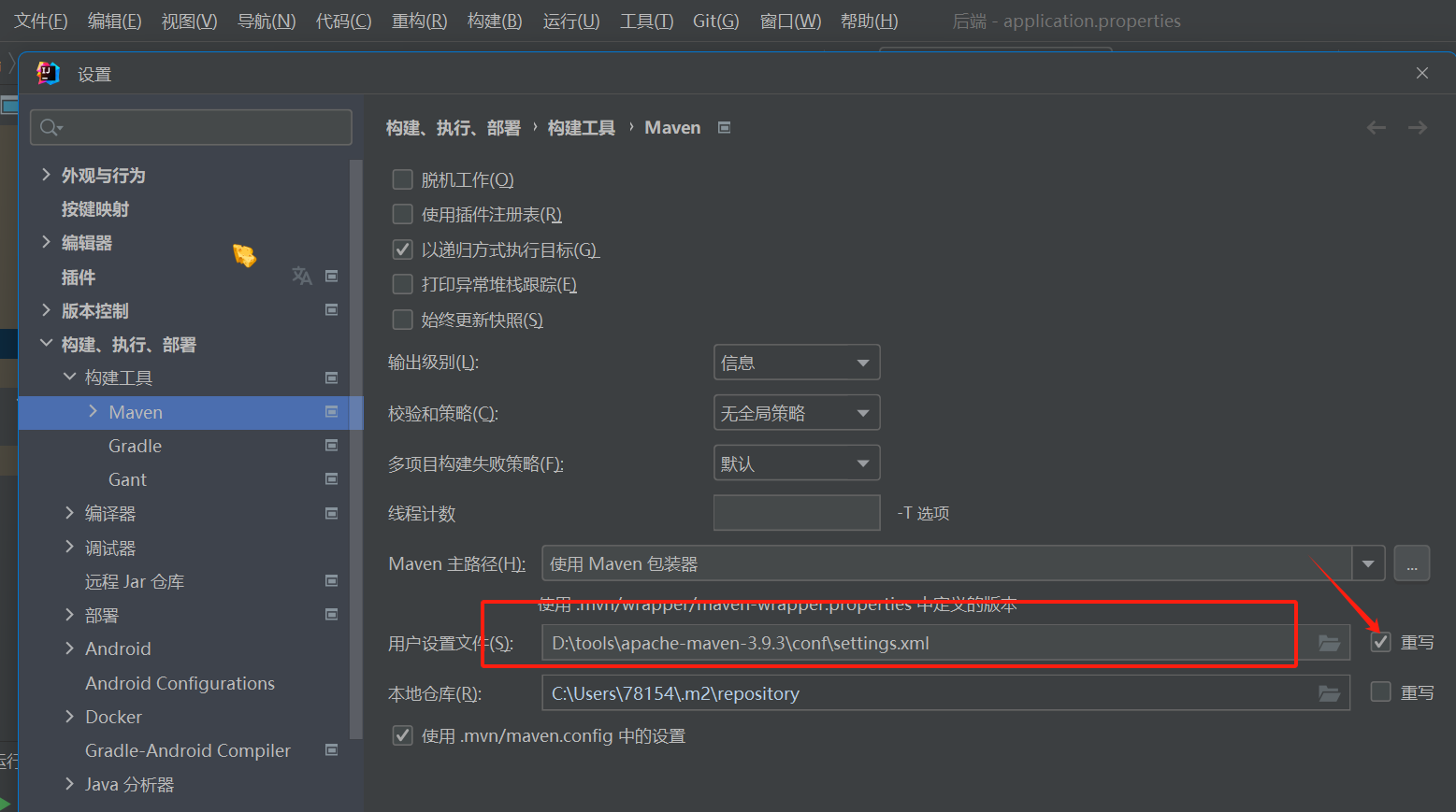 点击重写后在指定目录修改setting.xml,如果没有setting.xml手动则新建。