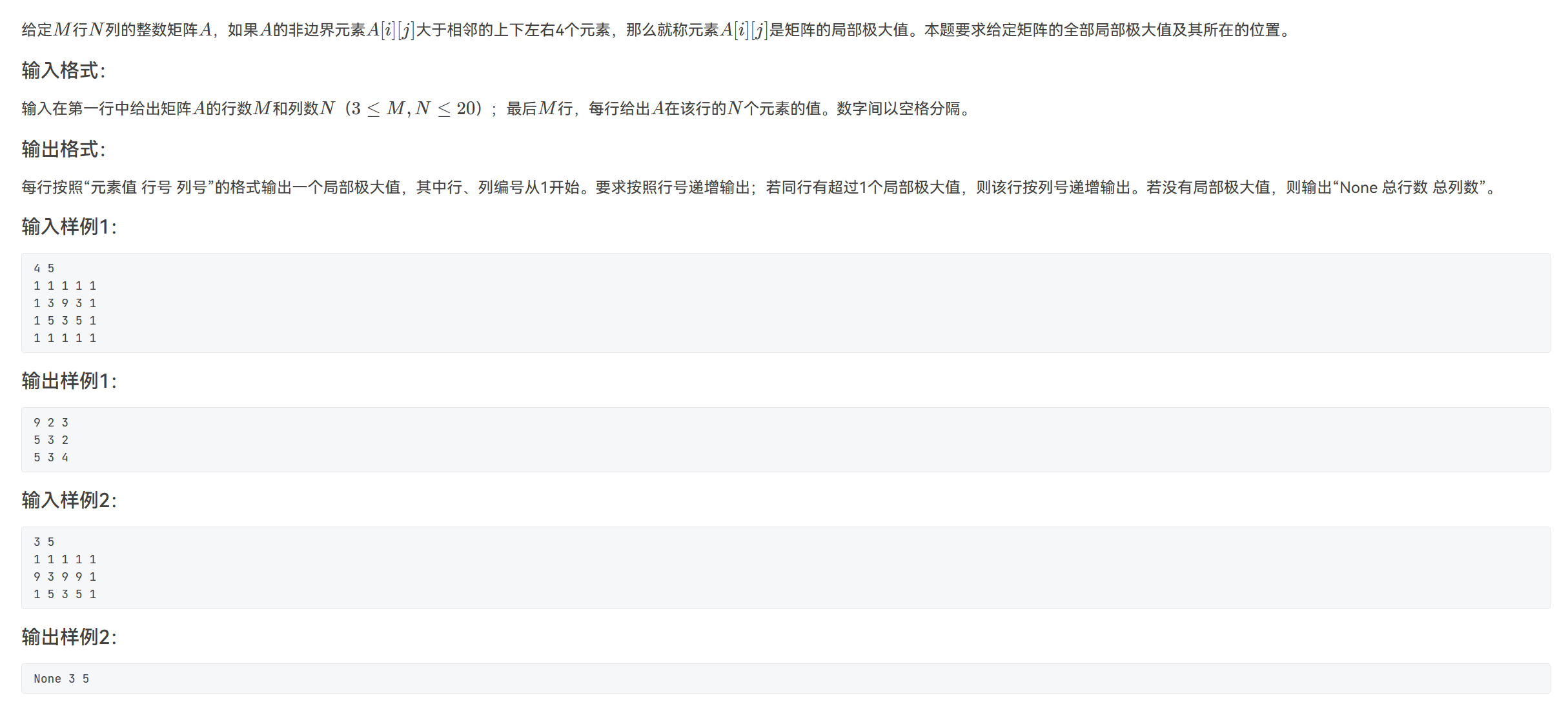 #include<stdio.h> int main() { int m,n,a[20][20],i,j; a[20][20]=0; scanf("%d %d",&m,&n); for(i=0;i<m;i++) for(j=0;j<n;j++) scanf("%d",&a[i][j]); for(i=1;i<m-1;i++) {for(j=1;j<n-1;j++) { if(a[i][j]>a[i+1][j]&&a[i][j]>a[i-1][j]&&a[i][j]>a[i][j+1]&&a[i][j]>a[i][j-1]) {printf("%d %d %d\n",a[i][j],i+1,j+1); a[20][20]=1;} }} if(a[20][20]==0) printf("None %d %d",m,n); return 0; }