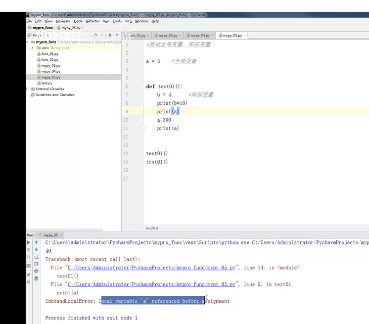 使用前必须要赋值,上面全局有a,你这局部再a,他就认为你这是一个局部变量,只是重名了