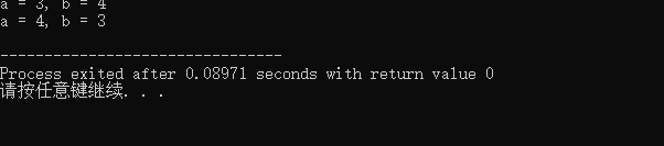 #include<stdio.h> int main() { int a, b, t; a = 3; b = 4; printf("a = %d, b = %d\n",a,b) ; t = a; a = b; b = t; printf("a = %d, b = %d\n",a,b); return 0; }3