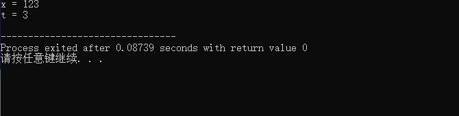 #include<stdio.h> int main() { int x, t, m; x = 123; printf("x = %d\n",x) ; t = 0; m = x % 10; t = t*10+m; x = x/10; printf("t = %d\n",t); return 0; }