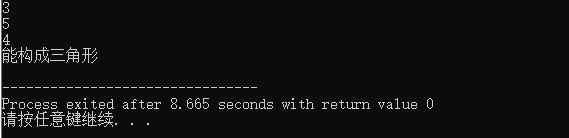 #include <stdio.h>> int main() { float a,b,c; scanf("%f%f%f",&a,&b,&c); if(a+b>c) printf("能构成三角形\n"); else printf("不能构成三角形\n"); return 0; }