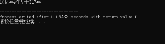 #include <stdio.h>> int main() { int year; year = 10000000000/365/24/60/60; printf("10亿年约等于%d年\n",year); return 0; }