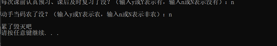 #include <stdio.h> #include <stdlib.h> int main() { char ans1, ans2; printf("每次课前认真预习、课后及时复习了没?(输入y或Y表示有,输入n或N表示没有):"); ans1 = getchar(); getchar(); printf("\n动手当码农了没?(输入y或Y表示农,输入n或N表示非农):"); ans2 = getchar(); if((ans1=='y'||ans1=='Y')&&(ans2=='y'||ans2=='Y')) printf("\n罗马不是一天建成的,继续保持哦:)\n"); else printf("\n累了毁灭吧\n"); system("pause"); return 0; }