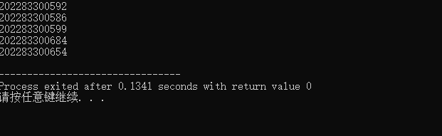#include<stdio.h> #include<stdlib.h> #include<time.h> #define N 5 #define R1 586 #define R2 701 int main() { int number; int i; srand(time(0)); for(i=0;i<N;++i) { number=rand()%(R2-R1+1)+R1; printf("20228330%04d\n",number); } return 0; }