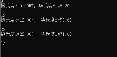 #include<stdio.h> #include<math.h> int main() { double c,F; while(scanf("%lf",&c)!=EOF) { F=c*9/5+32; printf("ÉãÊ϶Èc=%.2fʱ£¬»ªÊ϶Èf=%.2f\n",c,F); printf("\n"); } return 0; }
