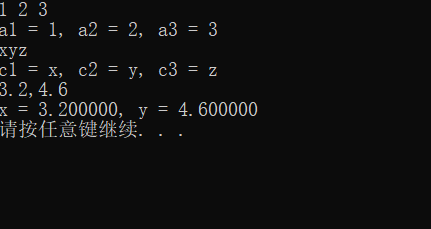 #include <stdio.h> #include<stdlib.h> int main() { double x, y; char c1, c2, c3; int a1, a2, a3; scanf("%d%d%d", &a1, &a2, &a3); /*加&*/ printf("a1 = %d, a2 = %d, a3 = %d\n", a1, a2, a3); getchar(); scanf("%c%c%c", &c1, &c2, &c3); getchar(); printf("c1 = %c, c2 = %c, c3 = %c\n", c1, c2, c3); scanf("%lf,%lf", &x, &y); /*lf*/ printf("x = %lf, y = %lf\n", x, y); system("pause"); return 0; }
