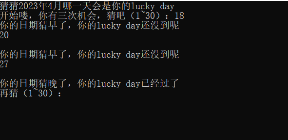 #include<stdio.h> #include<stdlib.h> #include<math.h> #include<time.h> int main() { int i,x,d; srand(time(0)); d=rand()%30+1; printf("猜猜2023年4月哪一天会是你的lucky day\n"); printf("开始喽,你有三次机会,猜吧(1~30):"); scanf("%d",&x); for(i=1;i<=3;i++) { if(x==d) { printf("噫,中了"); break; } else if(x < d) { printf("你的日期猜早了,你的lucky day还没到呢\n"); scanf("%d", &x); printf("\n"); continue; } else { printf("你的日期猜晚了,你的lucky day已经过了\n"); printf("再猜(1~30):"); scanf("%d", &x); printf("\n"); continue; } } printf("你的次数用完了,偷偷告诉你:4月,你的lucky day是%d号", d); }