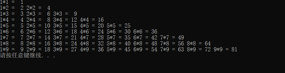 #include<stdio.h> #include<stdlib.h> #include<math.h> #include<time.h> int main() { int i, j; for(i = 1;i <= 9; i++) { for(j = 1;j <= i; j++) { printf("%d*%d =%3d ", j, i, j * i); } printf("\n"); } system("pause"); return 0; }