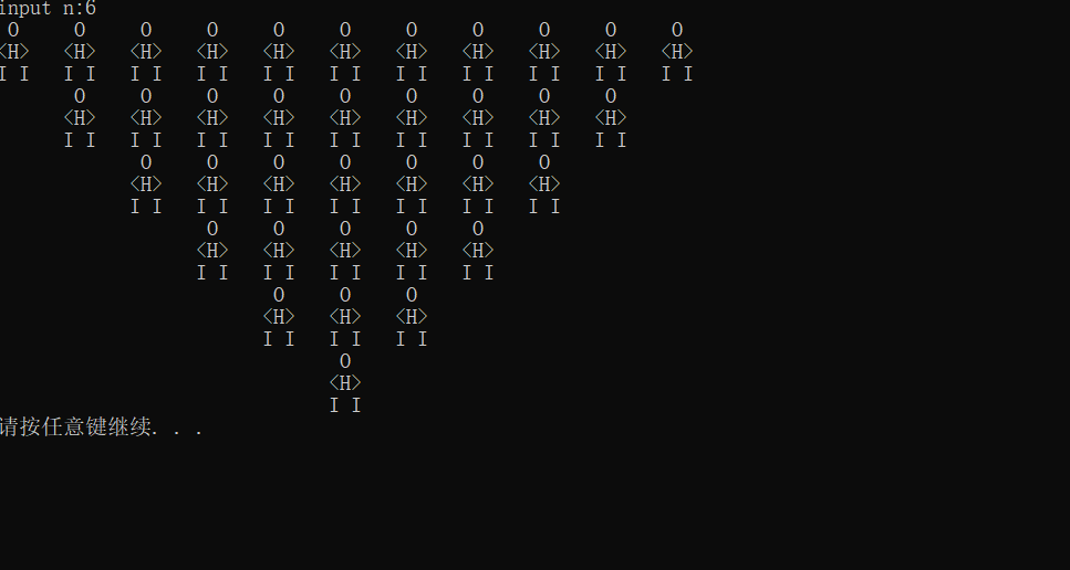 #include<stdio.h> #include<stdlib.h> int main() { int n; printf("input n:"); scanf("%d", &n); for(int i = 1;i <= n; i++) { for(int k = 1;k <= 3; k++) { for(int j = 1;j <= i - 1; j++) { printf(" "); } for(int j = 1;j <= 2 * (n - i) + 1; j++) { if(k == 1) printf(" O "); if(k == 2) printf("<H> "); if(k == 3) printf("I I "); } printf("\n"); } } system("pause"); return 0; }