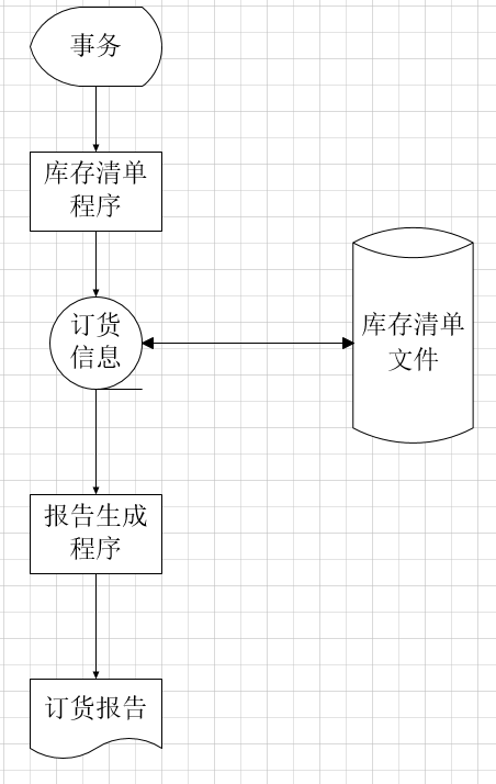 库中的CRT终端输入到计算机中;系统中的库存清单程序对事务进行处理,更新存储在磁盘上的库存清单主文件,并且把必要的订货