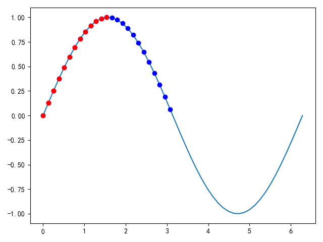 import matplotlib.pyplot as plt a = np.linspace(0, 2 * np.pi, 50) b = np.sin(a) plt.plot(a,b) mask = b >= 0 plt.plot(a[mask], b[mask], 'bo') mask = (b >= 0) & (a <= np.pi / 2) plt.plot(a[mask], b[mask], 'ro') #后生成的红色点遮挡了原来的蓝色点 plt.show()