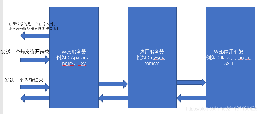 应用服务器:负责处理逻辑的服务器,例如编写的python代码,是不能直接通过nginx这种web服务器来处理的,只能通过应用服务器来处理,常见的应用服务器有uwsgi、tomcat等。