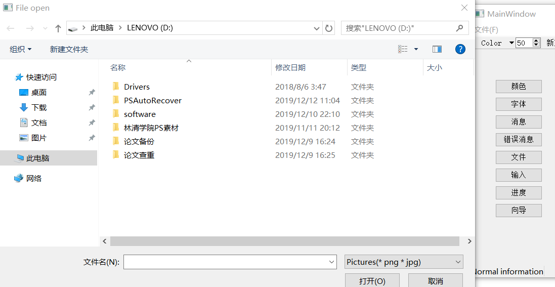 例如:对于上述的open菜单,设计一个对话框,非模态对话框就是当对话框弹出时,用户任然可以和其他的窗口进行交互。模态对话框则不行,只有将对话框关闭,才可以和其他的对话框进行交互。