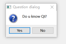 int ret1 = QMessageBox::question(this, "Question dialog", "Do u know Qt?", QMessageBox::Yes, QMessageBox::No);