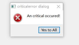 int ret4 = QMessageBox::critical(this, "criticalerror dialog", "An critical occured!", QMessageBox::YesAll);
