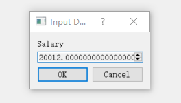 double salary = QInputDialog::getDouble(this, "Input Dialog", "Salary", 20000, 5000, 100000, 500.45, &ok);
