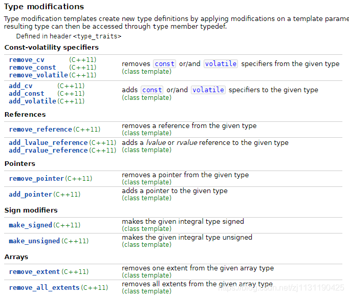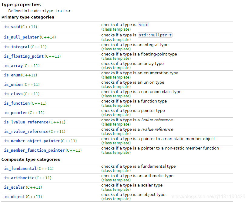 例如:std::is_void, std::is_floating_point等等,具体的可以参考:https://en.cppreference.com/w/cpp/types,例如,常用的traits类型判断: