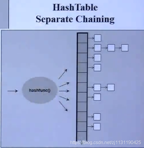可以将上述的每个一深色的方块看作一个bucket,每个篮子中的元素用链表表示(seperate chaining), hash可以理解为:假如有二十个空间,现在放入一个元素进去,元素放入的位置需要通过计算得到,假设元素a经过计算需要放到第三个位置去,元素b经过计算也要放到第三个位置去,这时就会发生碰撞。一种解决方法是:通过一定的计算方式将他们分开放置。另一种方法是:既然碰撞,索性都放到同一个bucket中,以链表表示。这是目前最好的做法。
