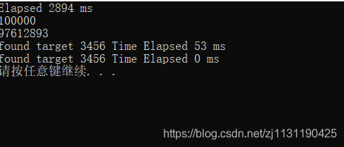 cout << "found target " << *pItem << " Time Elapsed " << timer.elapsed() << " ms" << endl;