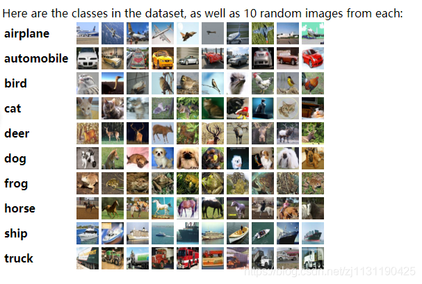 CIFAR-10数据集共有60000张彩色图像,这些图像是32*32,分为10个类,每类6000张图。这里面有50000张用于训练,构成了5个训练批,每一批10000张图;另外10000用于测试,单独构成一批。测试批的数据里,取自10类中的每一类,每一类随机取1000张。抽剩下的就随机排列组成了训练批。注意一个训练批中的各类图像并不一定数量相同,总的来看训练批,每一类都有5000张图。