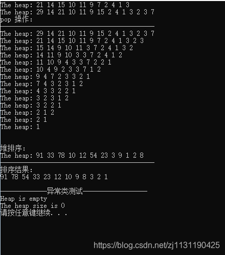 当最大堆在删除元素时,如果堆中没有元素,则抛出异常:这一功能由自定义的异常类heap_empty_exception实现: