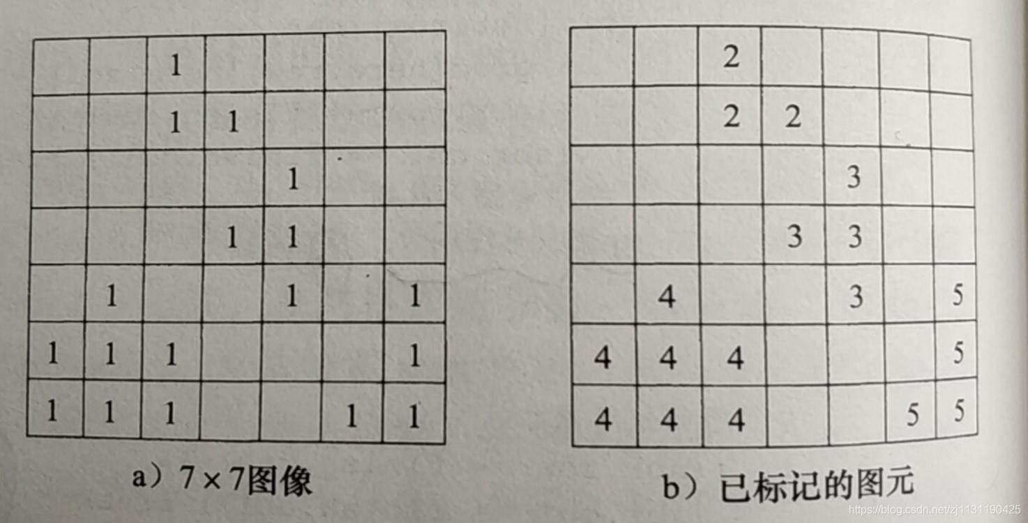 数字化图像可以看作m*m的矩阵,单色如图中,像素点的值为0,1.值为0的点表示背景,为1的点表示图元上的一个点。两个相邻的图元像素是同一个图元的像素,图元识别就是给同一个图元的像素做标记。