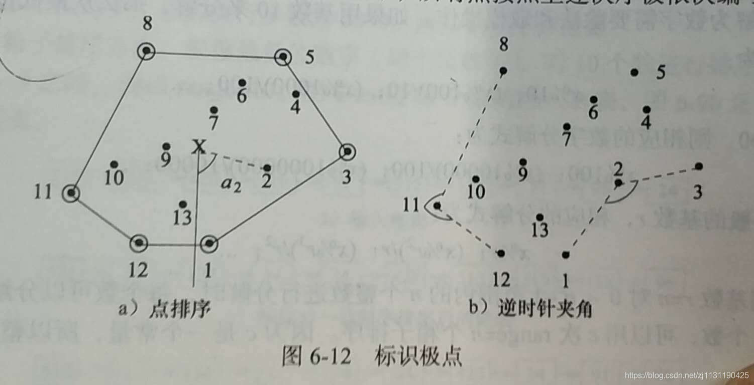 如果u,v,w是按照逆时针排列的三个连续的极点,从u->v,w->v之间的连线的夹角应该大于180,当按照极角排列的三个点的极角小于等于180时,则第二个点不是极点,可以将其删除。因为当按照逆时针方向在一个凸多边形上行走时,所有的转弯都是向左转。