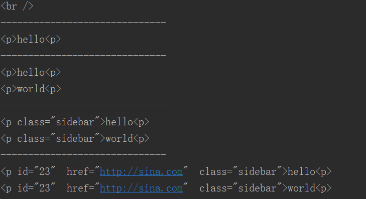 print(tag('p', 'hello', 'world', id=23, href='http://sina.com', cls='sidebar'))