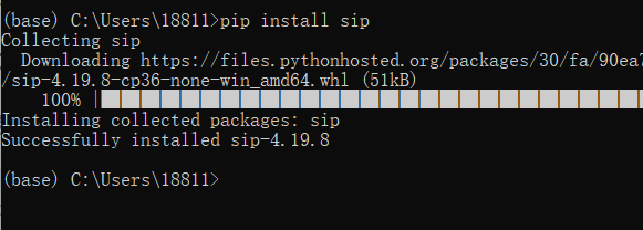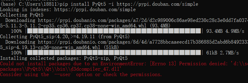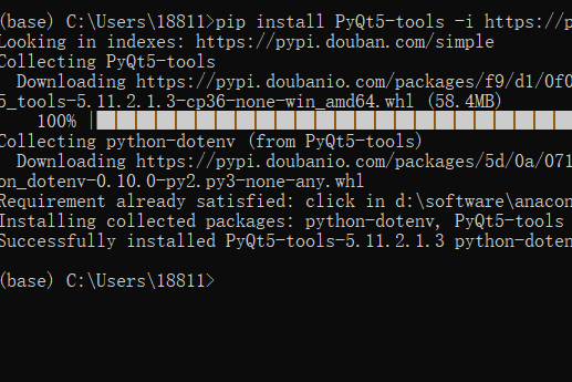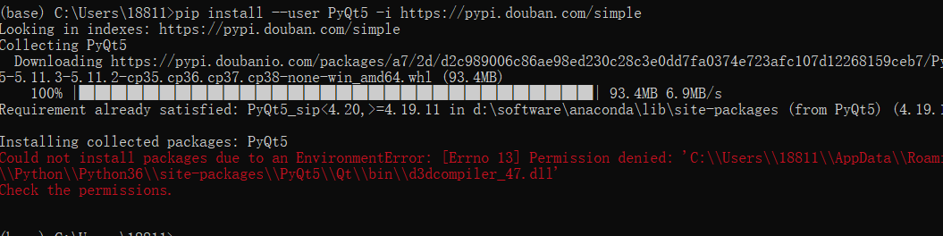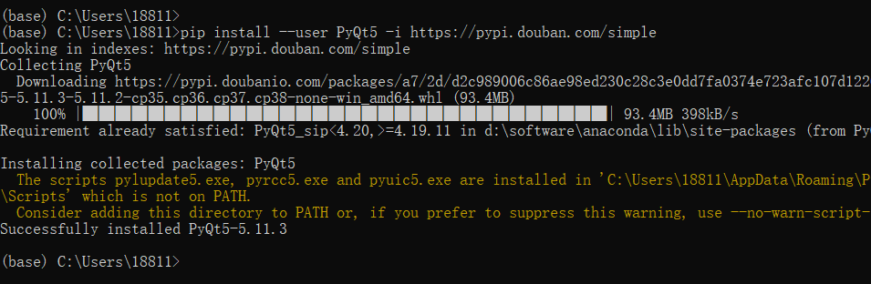 这下再次在anaconda prompt下输入:pip install --user PyQt5 -i https://pypi.douban.com/simple