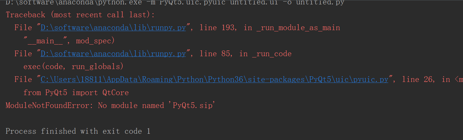 晚上仔细回想了一下,白天在使用pip安装PyQt5的时候遇到权限问题,写入C盘需要用到user权限,当时也就将安装命令pip install PyQt5 -i https://pypi.douban.com/simple修改为pip install --user PyQt5 -i https://pypi.douban.com/simple,成功安装。结果后面就报错了。