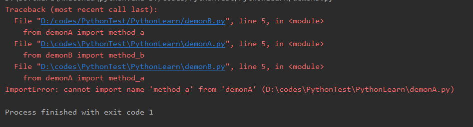 2. 执行A文件中的代码,首先执行from demonB import method_b,此时demonB不再sys.modules中,因此回去执行B文件中的代码,此时执行from demonA import method_a,这个时候demonA已经在sys.modules中,但是此时A文件中还未执行到方法method_a()定义的位置,因此import method_a便会报错。