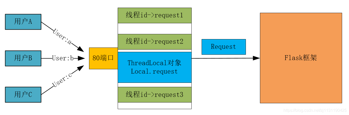 local对象的原理:在local对象中,有一个字典,字典中存储的是,线程的id, 以及用户的请求内容。在多线程中,如果需要访问request中的值,因为此时的request对象是绑定在local对象上的,因此local对象会根据当前代码在哪一个线程下运行的,找到线程的id,以及对应线程下面request的内容,再将这邪恶内容放入到request对象中。
