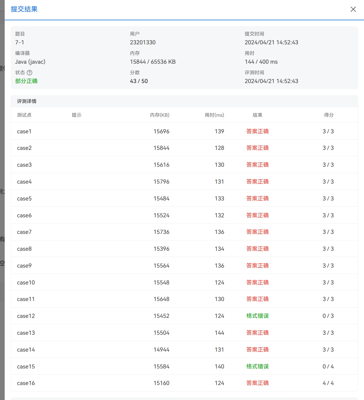 第一次的坑估计就是格式问题,含多余的空格我当时无法确认怎么处理,后来发现java中字符串提供的trim方法好像能完美解决这个问题,但是不知道为什么我对接收题号的字符串再进行trim方法后进行强制类型转化为integer后系统一直不通过,我想是不是题号根本就不要用int类型来定义会好一点,统一用String来处理。