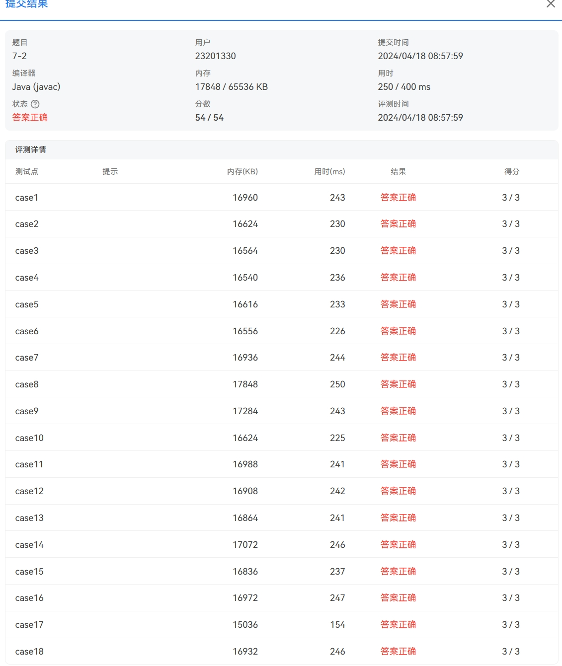 第二次的坑其实我觉得还好,虽然PTA第一次发布的时候由于时间问题耽搁了一会没提交上,但我在截止后的两天内还是完成了并将源码复制提交在补练拿到了满分,其坑就是对答卷和试卷的不同判断,比如答卷为空,试卷不存在,但也可能是我用了面向过程的方法,导致侥幸拿到了分,就比如PTA2我最后判题输出是用了一个嵌套多层循环的方法进行(如下)。