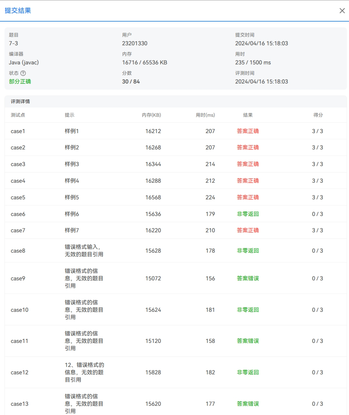 第二题的思路是一直接收多种类型(问题啊,试卷啊,答卷啊等等)字符串直到接收到"end"停止,再把所有信息通过正则表达式分类存入已经定义好的多种类型的ArrayList中,最后通过试卷对答卷的方法进行判题输出,只要花了足够的时间不难拿到满分。