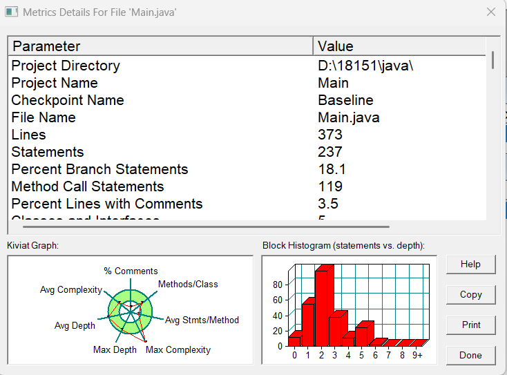 Block Histogram(柱状图):展示语句数量与代码深度(嵌套层数)的关系。从图中可以看到,深度为 1 的语句数量最多,随着深度增加,语句数量逐渐减少,但深度为 2、3 等仍有不少语句,说明代码中存在一定的嵌套结构。