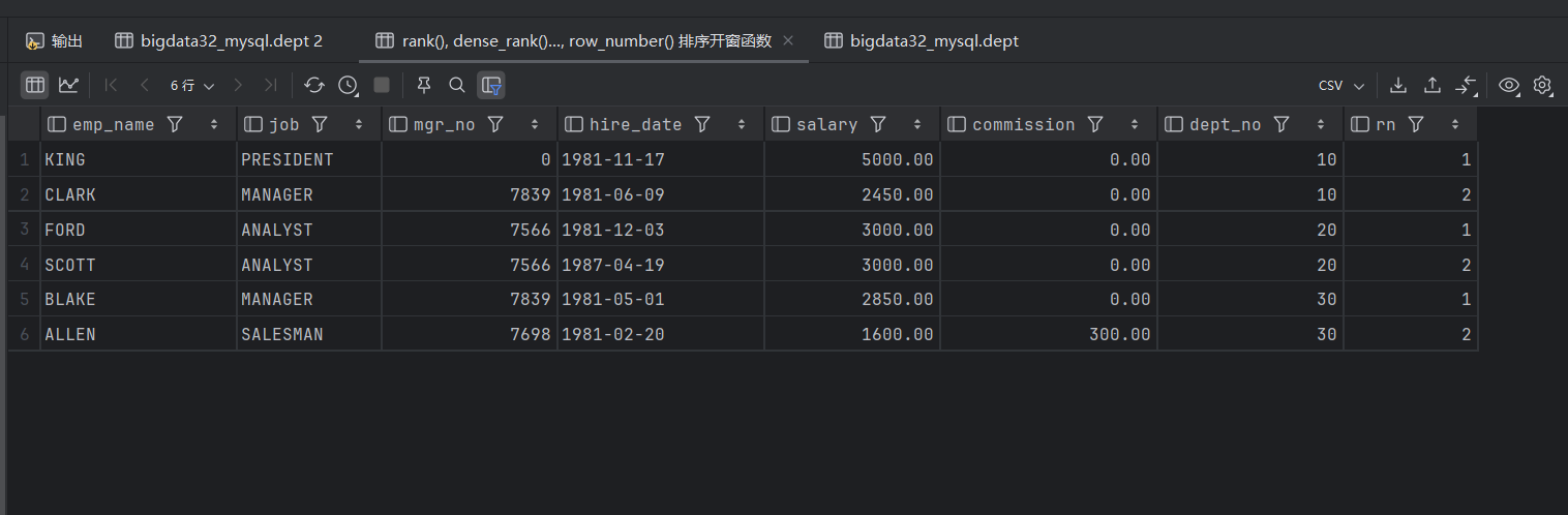 row_number() over (partition by dept_no order by salary desc) as rn,