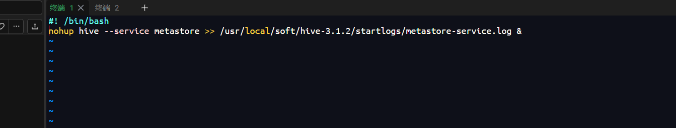 nohup hive --service metastore >> /usr/local/soft/hive-3.1.2/startlogs/metastore-service.log &